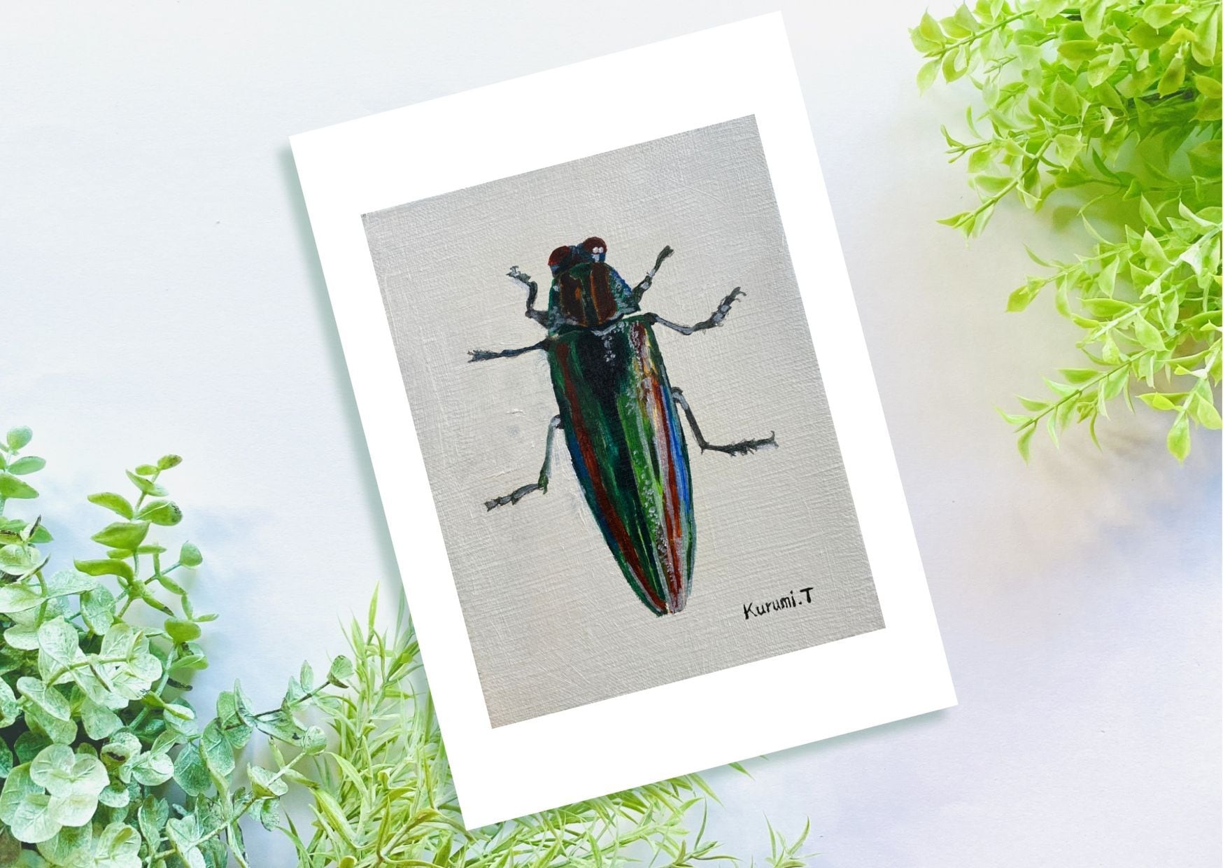 ニホンタマムシの絵のポストカードです。 原画は油彩です。 実際の色味は画像と異なることがございます。 高級OPPフィルム使用クリスタルパックS-ハガキ用に入れてお送りします。 紙質:アートポスト180kg / ポストカード印刷(オンデマンド)/ サイズ:100×148mm ヤマト運輸で発送いたします。