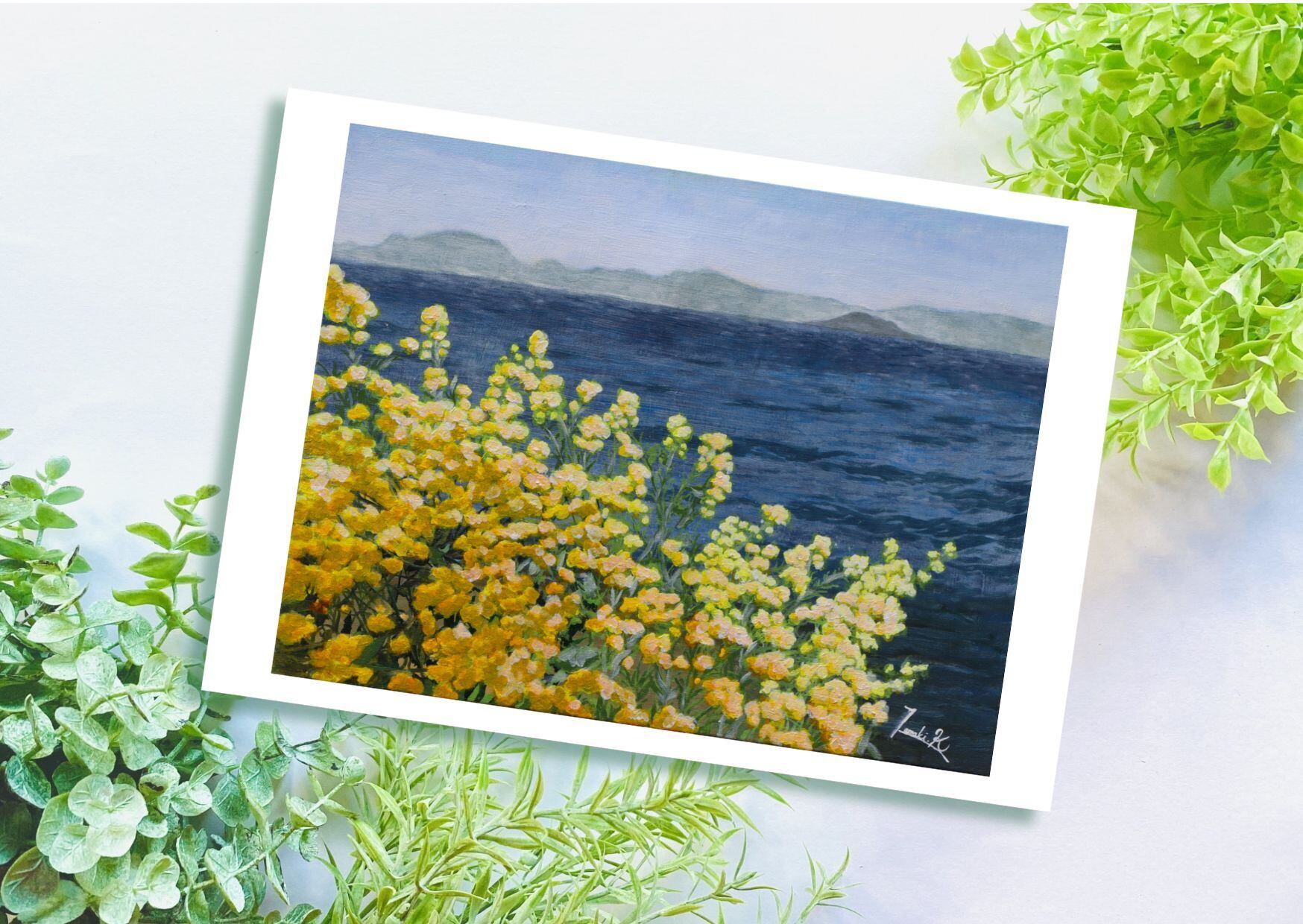 黄色い花と琵琶湖のポストカードです。 原画は油彩です。 実際の色味は画像と異なることがございます。 高級OPPフィルム使用クリスタルパックS-ハガキ用に入れてお送りします。 紙質:アートポスト180kg / ポストカード印刷(オンデマンド)/ サイズ:100×148mm ヤマト運輸で発送いたします。